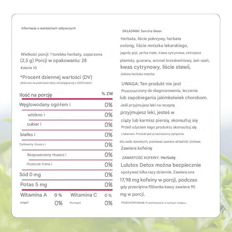 W przeciwieństwie do mocnych herbat detoksykujących, ta nie powoduje wzdęć ani dyskomfortu. Dodaje mi naturalnej energii i zauważyłam poprawę trawienia. Schudłam 1,5 kg w 10 dni – gorąco polecam!